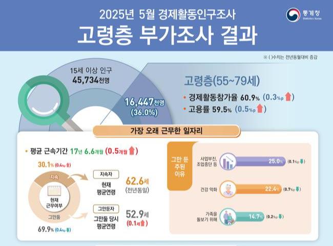 • 고령층 고용률 59.5%로 0.5%p 상승... 근속기간 평균 17년 6.6개월
