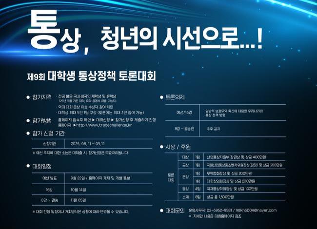 산업통상자원부가 오는 9월 12일까지 `2025년 대학생 통상정책 토론대회` 참가 신청을 받는다.