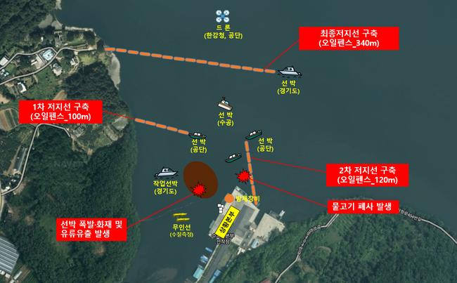 훈련은 팔당호에서 운영 중인 청소선이 파손돼 연료탱크 내 경유 약 2,000리터가 유출되면서 어류 폐사까지 발생하는 복합사고 상황을 가정해 구성됐다.