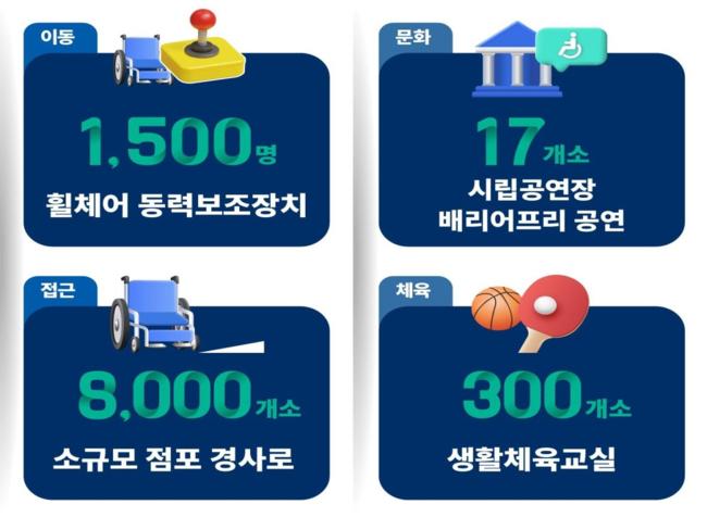 또한 소규모 점포 출입구 경사로를 8,000곳에 설치하고, 모든 횡단보도에 음향신호기를 도입할 예정이다.