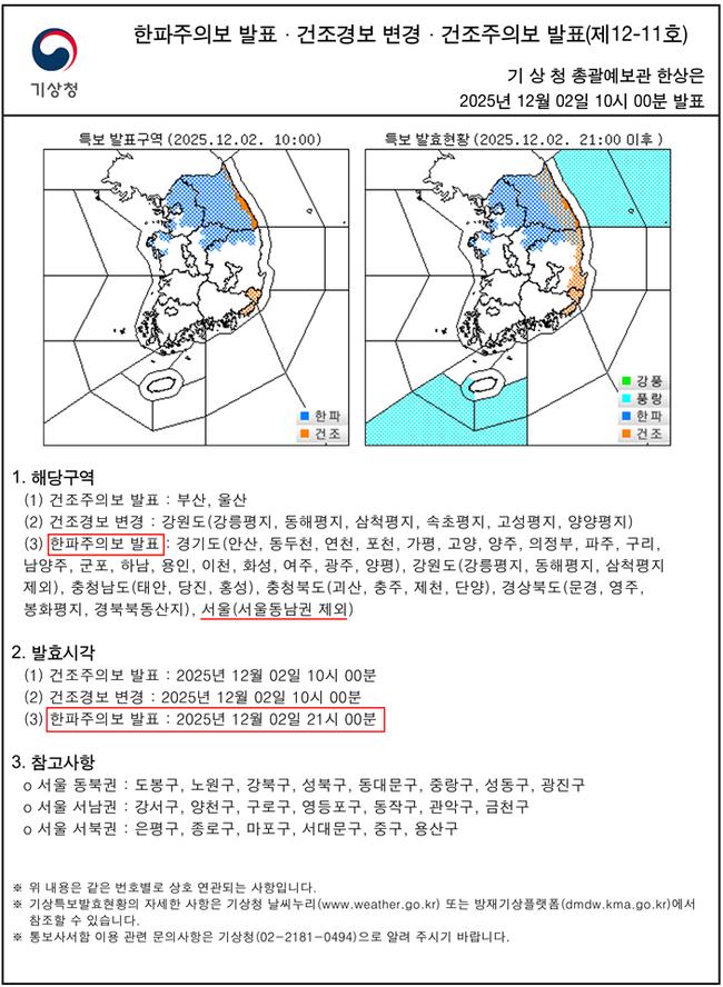 한파주의보 발표 현황 (`25. 12. 2. 10시)