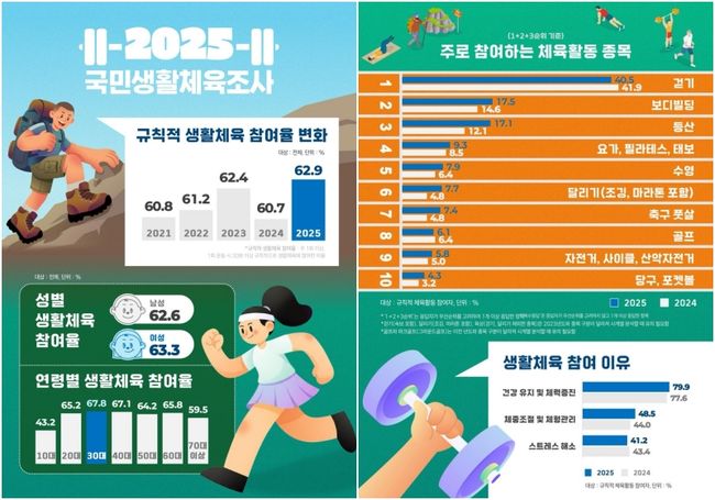 문화체육관광부는 만 10세 이상 국민 9천 명을 대상으로 한 ‘2025년 국민생활체육조사’ 결과, 생활체육 참여율이 62.9%로 전년 대비 2.2%포인트 상승하며 참여 빈도와 평균 운동 시간, 참여 기간이 모두 늘었다고 밝혔다.