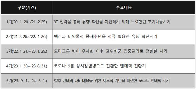백서는 코로나19 유행과 정책 전환을 중심으로 대응 전략의 변화에 따라 5개 시기로 구분해 각 시기의 특징과 대응 흐름을 정리했다.