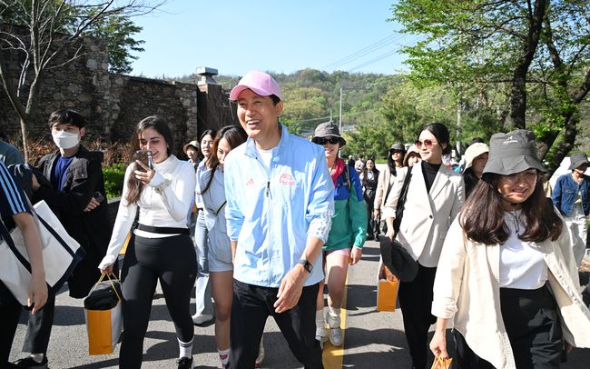오세훈 서울시장이 24일(목) `서울 등산관광센터 관악산점 개관식`을 찾은 시민들과 함께 걷고 있다.