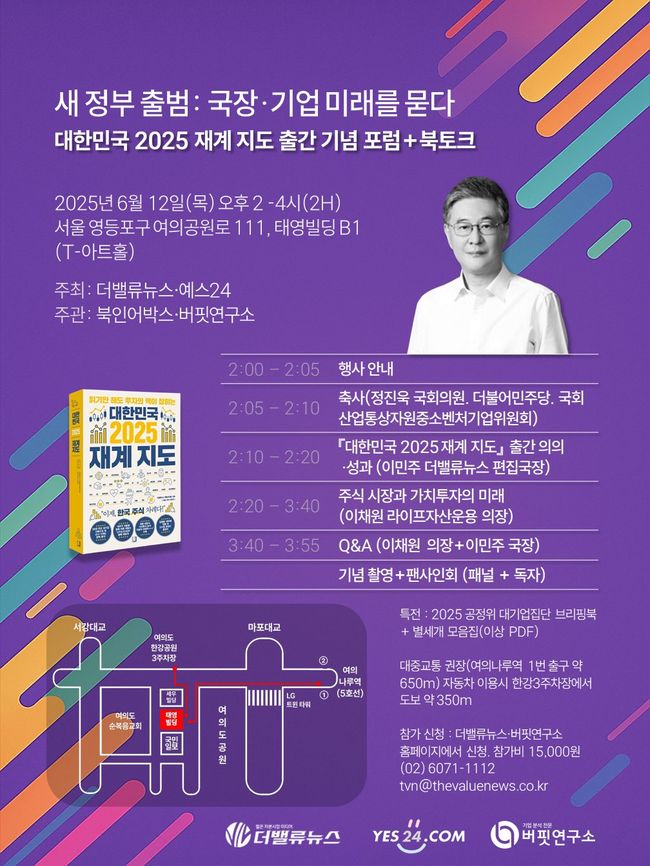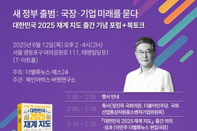 더밸류뉴스와 예스24는 새 정부 출범을 앞둔 시점에서 국내 주식시장과 기업의 미래를 조망하는 `대한민국 2025 재계 지도 출간 기념 포럼`을 오는 6월 12일 서울 여의도 태영빌딩 T-아트홀에서 개최한다.